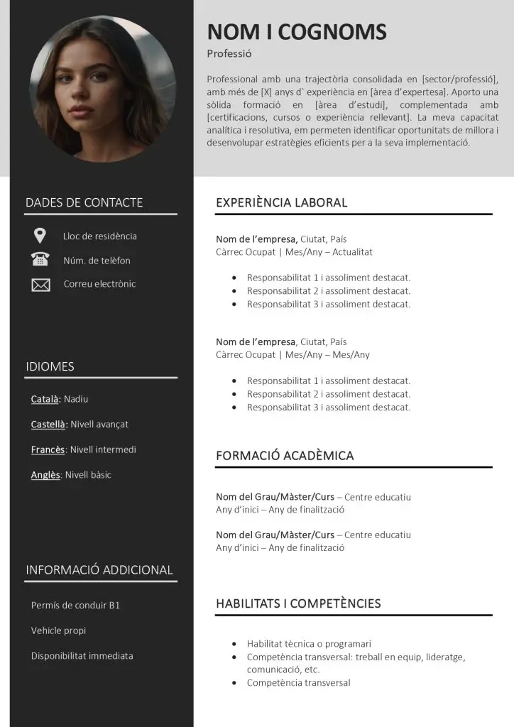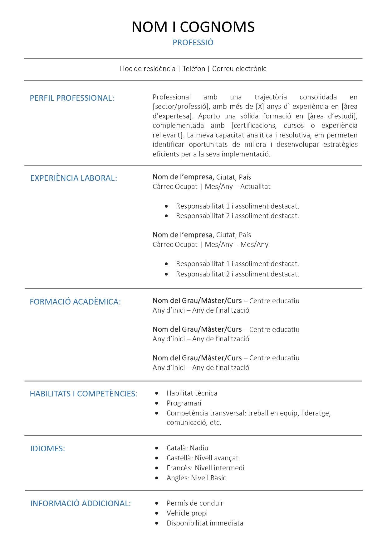 Incloure un resum professional a l’inici del currículum pot ajudar a captar l’atenció del reclutador. En tres o quatre línies, destaca la teva experiència, competències clau i objectius professionals.